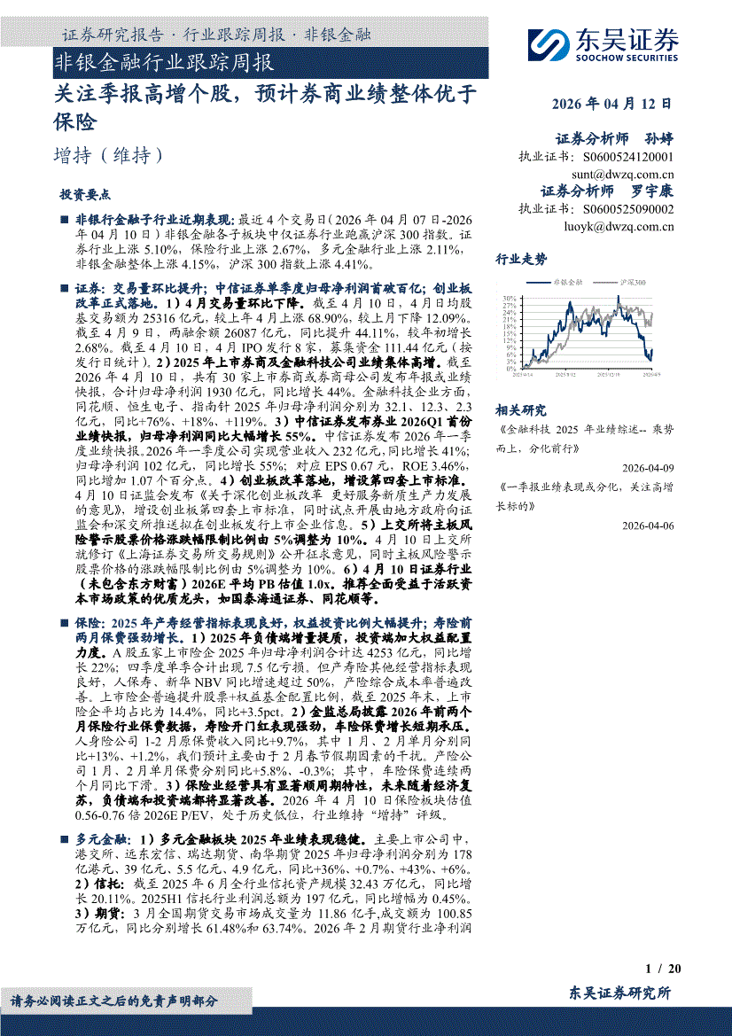 非银金融行业:东吴证券-非银金融行业跟踪周报:关注季报高增个股,预计券商业绩整体优于保险-260412