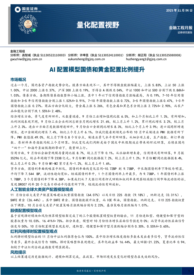 国金证券-量化配置视野:AI配置模型国债和黄金配置比例提升-251106