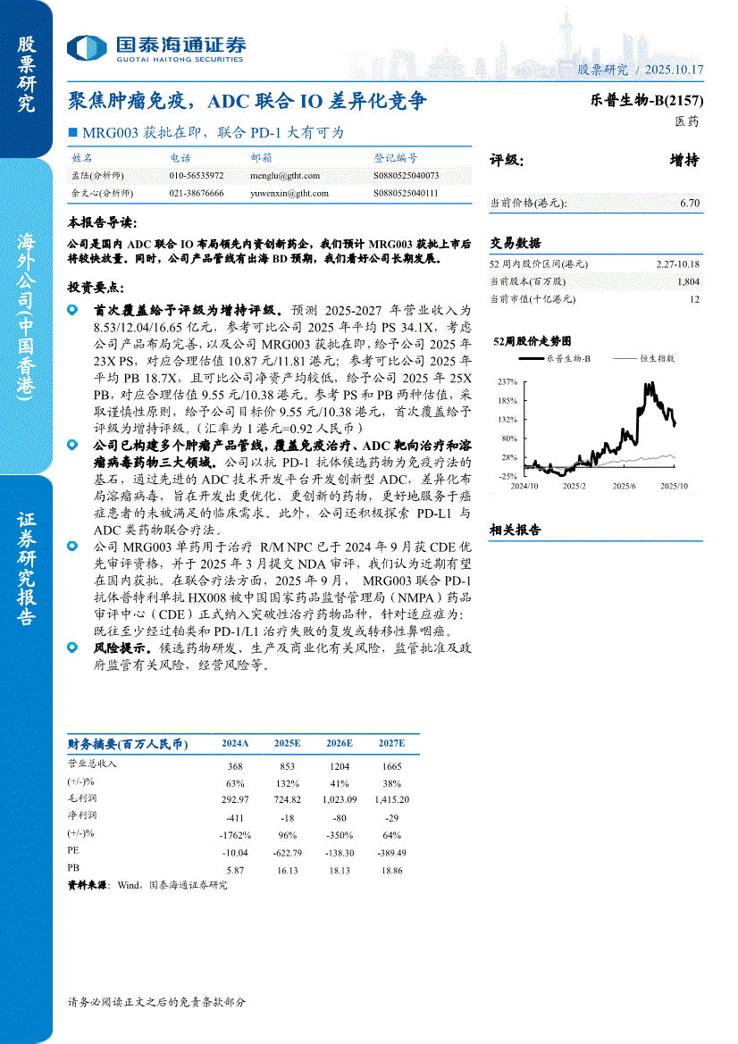 乐普生物~B:国泰海通证券-乐普生物~B-2157.HK-MRG003获批在即,联合PD~1大有可为:聚焦肿瘤免疫,ADC联合IO差异化竞争-251017