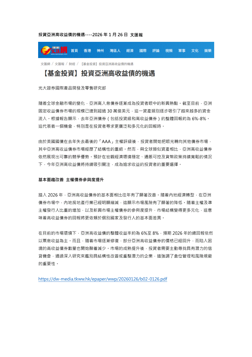 光大证券(国际)-【基金投资】投资亚洲高收益债的机遇-260126