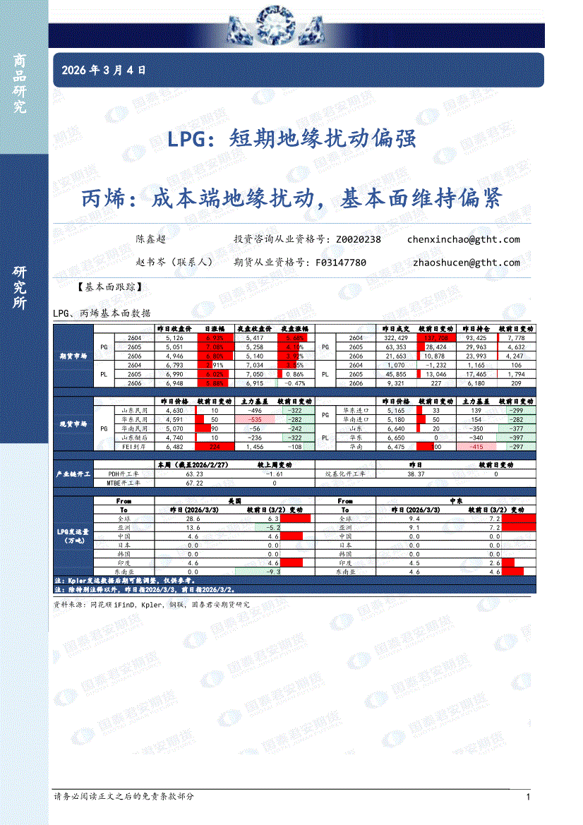 国泰君安期货-LPG:短期地缘扰动偏强,丙烯,成本端地缘扰动,基本面维持偏紧-260304