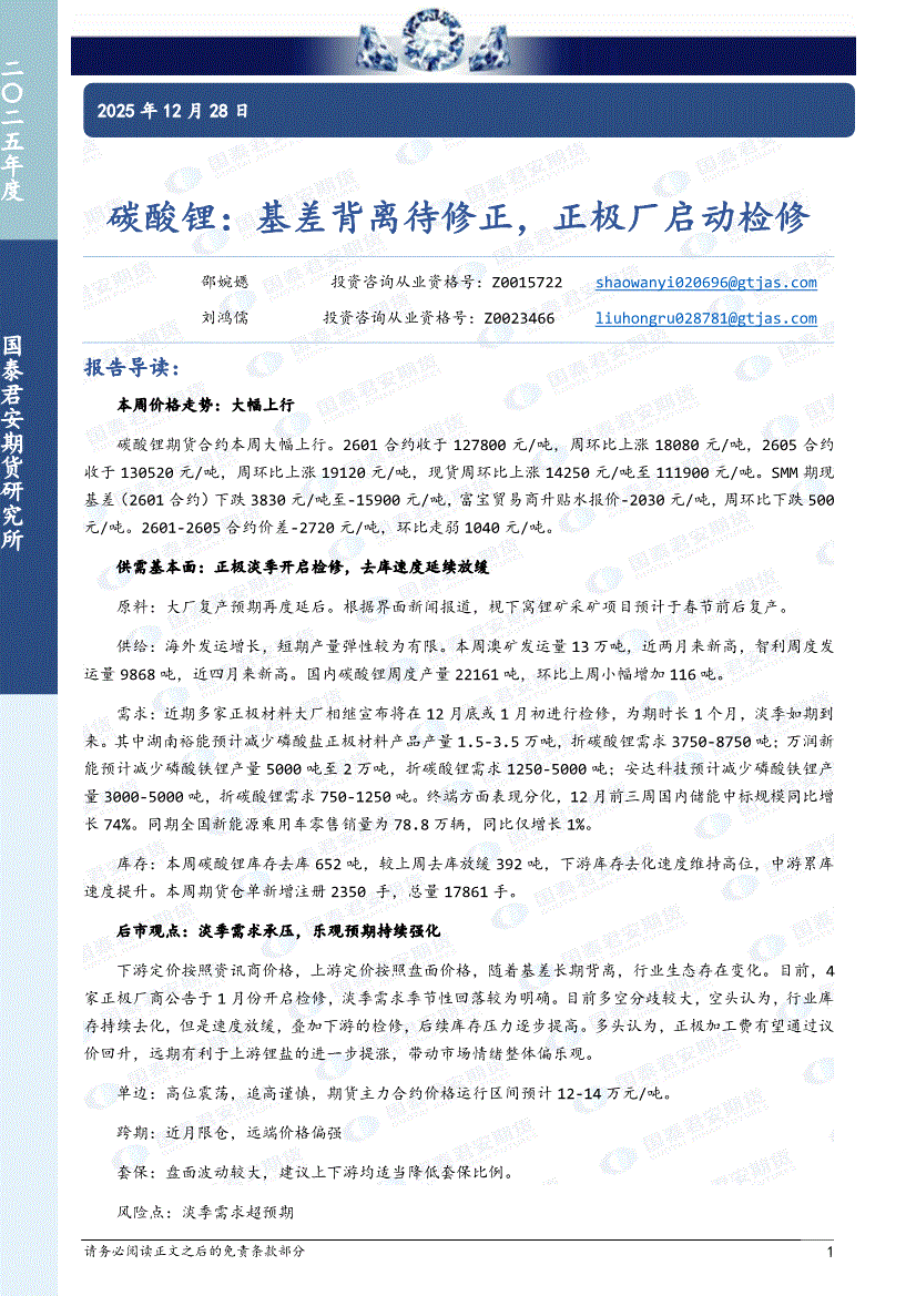 国泰君安期货-碳酸锂:基差背离待修正,正极厂启动检修-251228
