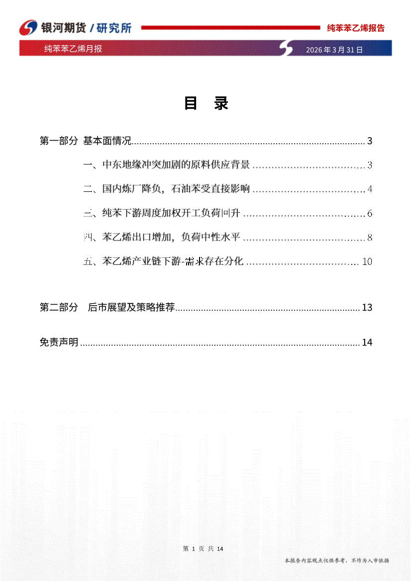 银河期货-纯苯苯乙烯月报:地缘冲突下芳烃供应偏紧,苯进口同比下降-260331