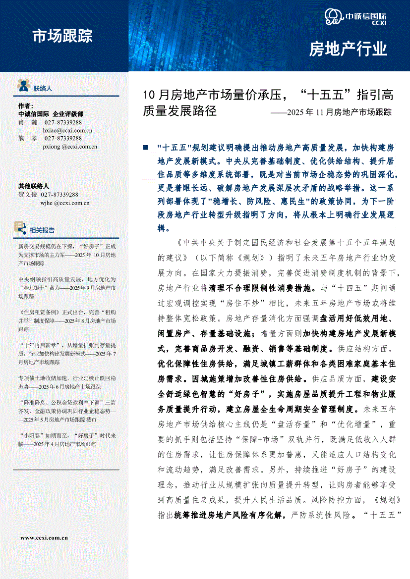 房地产行业:中诚信国际-2025年11月房地产行业市场跟踪:10月房地产市场量价承压,“十五五”指引高质量发展路径-251128