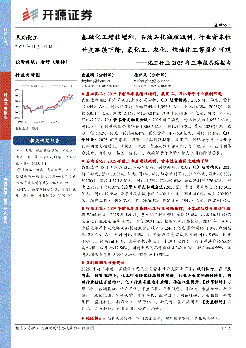 化工行业:开源证券-化工行业2025年三季报总结报告:基础化工增收增利,石油石化减收减利,行业资本性开支延续下降,氟化工、农化、炼油化工等盈利可观-251105