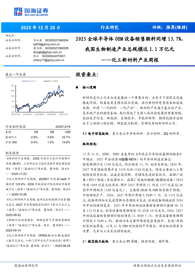化工新材料产业行业:国海证券-化工新材料产业行业周报:2025全球半导体OEM设备销售额料同增13.7%,我国生物制造产业总规模达1.1万亿元-251220