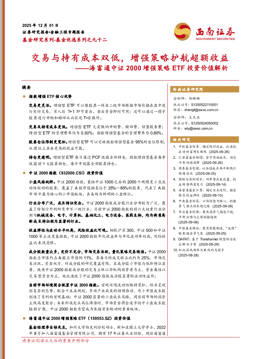 西南证券-基金研究系列~基金优选系列之九十二:海富通中证2000增强策略ETF投资价值解析,交易与持有成本双低,增强策略护航超额收益-251201