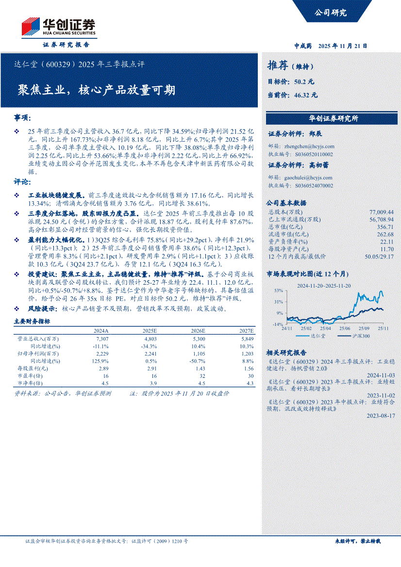 达仁堂:华创证券-达仁堂-600329-2025年三季报点评:聚焦主业,核心产品放量可期-251121