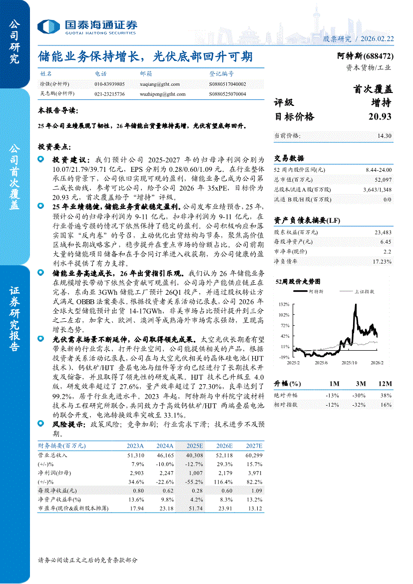 阿特斯:国泰海通证券-阿特斯-688472-储能业务保持增长,光伏底部回升可期-260222
