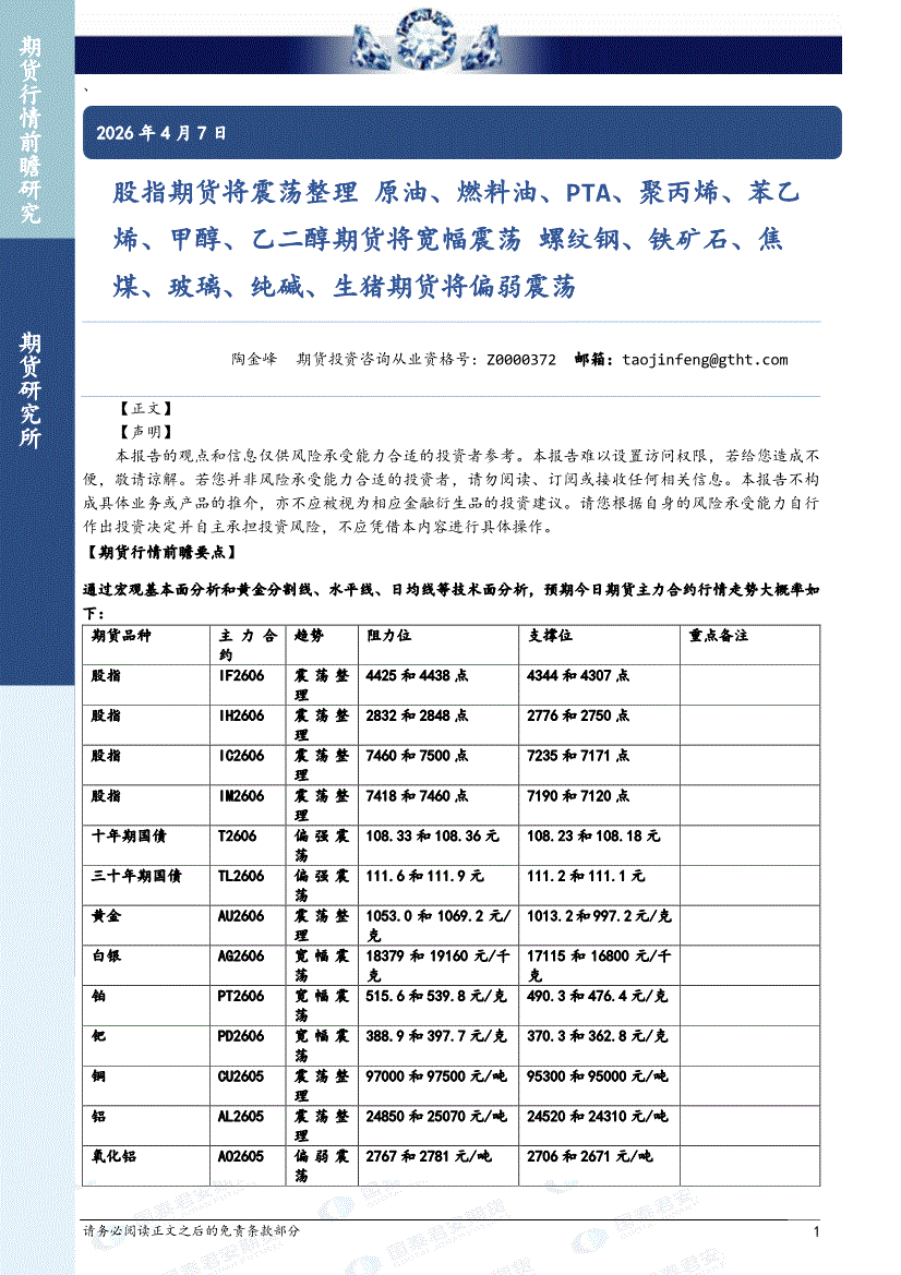 国泰君安期货-股指期货将震荡整理,原油、燃料油、PTA、聚丙烯、苯乙烯、甲醇、乙二醇期货将宽幅震荡,螺纹钢、铁矿石、焦煤、玻璃、纯碱、生猪期货将偏弱震荡-260407