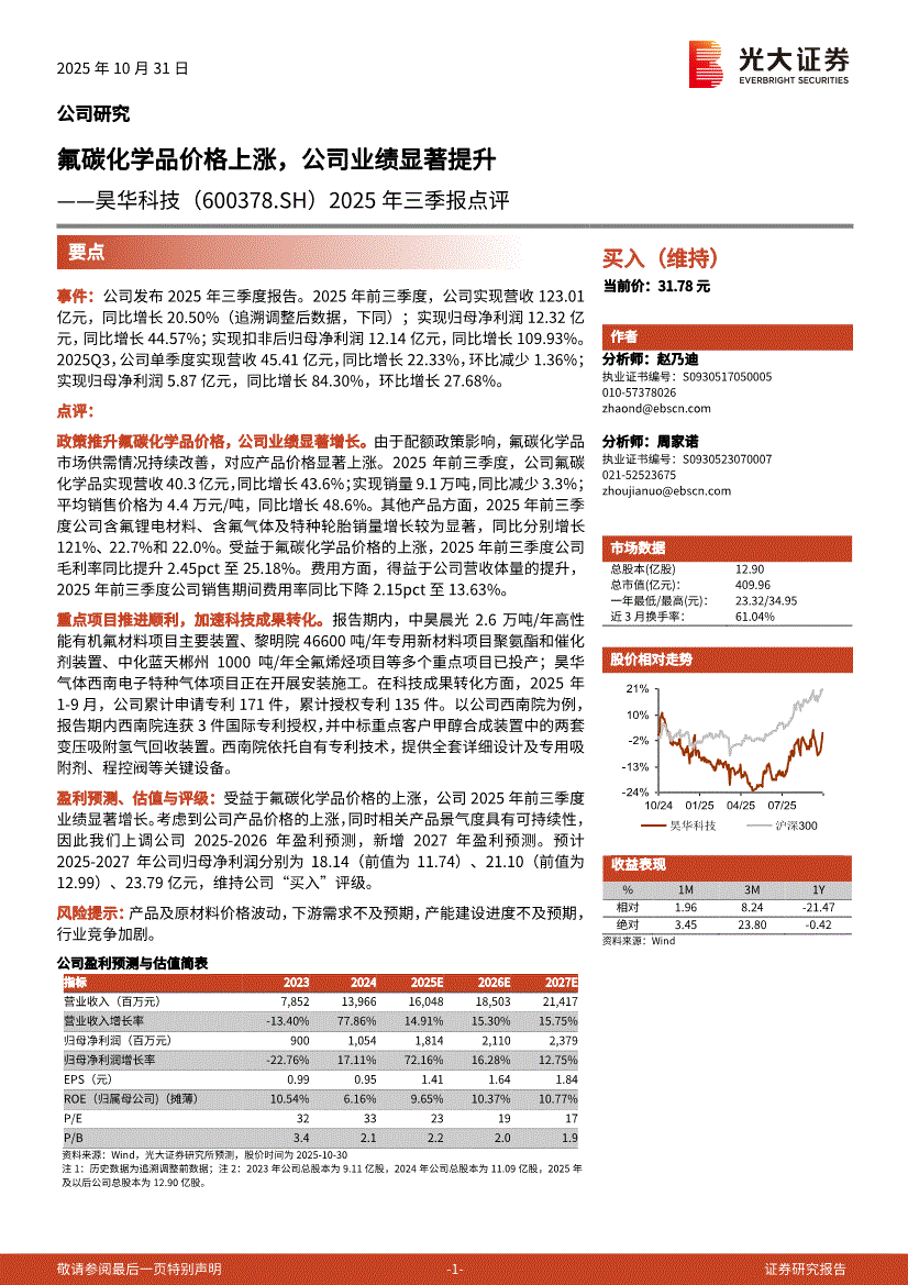 昊华科技:光大证券-昊华科技-600378-2025年三季报点评:氟碳化学品价格上涨,公司业绩显著提升-251031