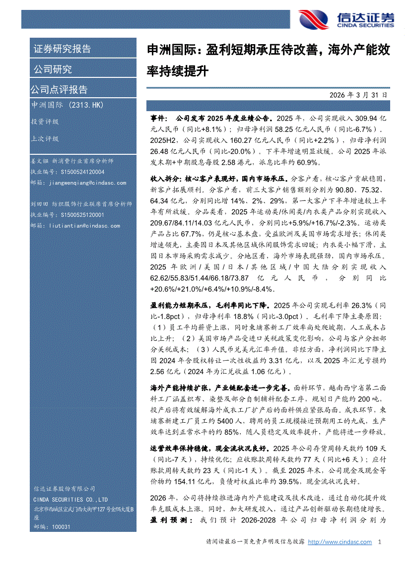 申洲国际:信达证券-申洲国际-2313.HK-盈利短期承压待改善,海外产能效率持续提升-260331