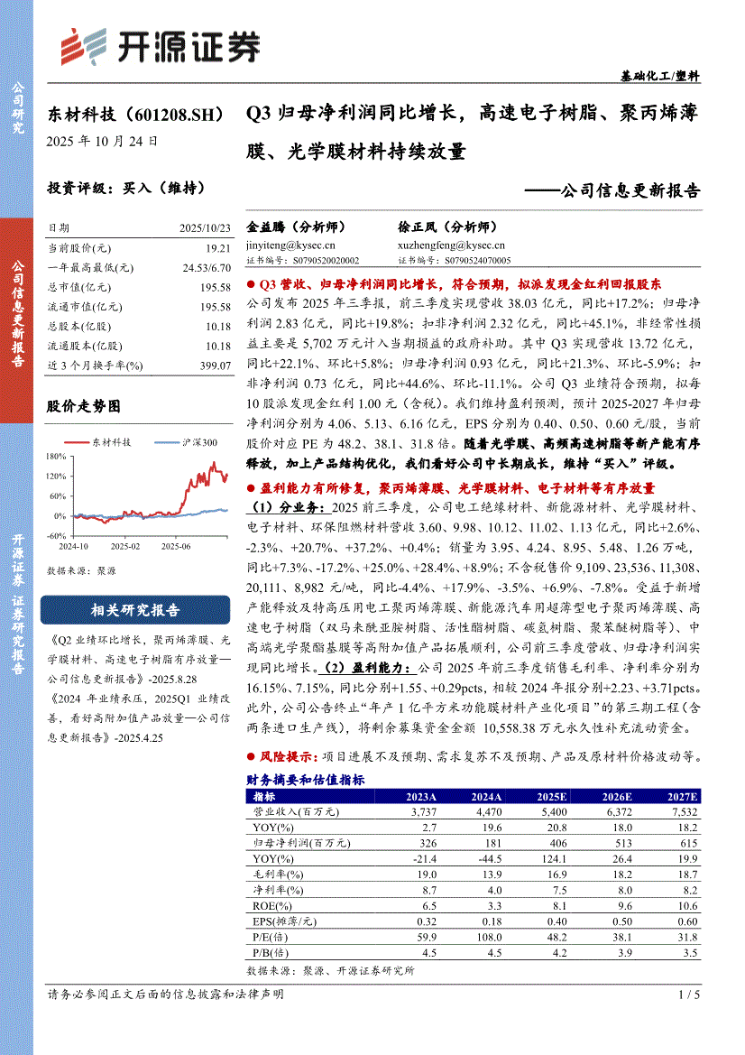 东材科技:开源证券-东材科技-601208-公司信息更新报告:Q3归母净利润同比增长,高速电子树脂、聚丙烯薄膜、光学膜材料持续放量-251024