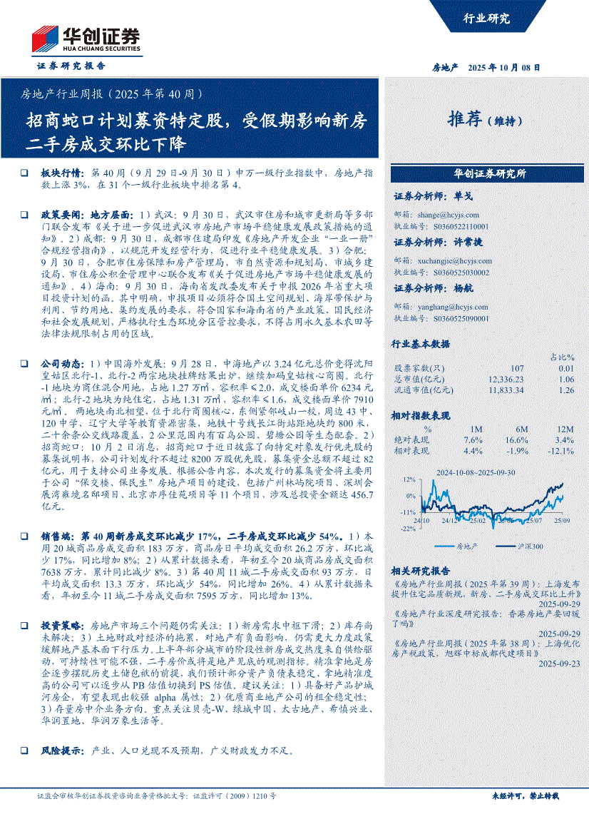 房地产行业:华创证券-房地产行业周报(2025年第40周):招商蛇口计划募资特定股,受假期影响新房二手房成交环比下降-251008