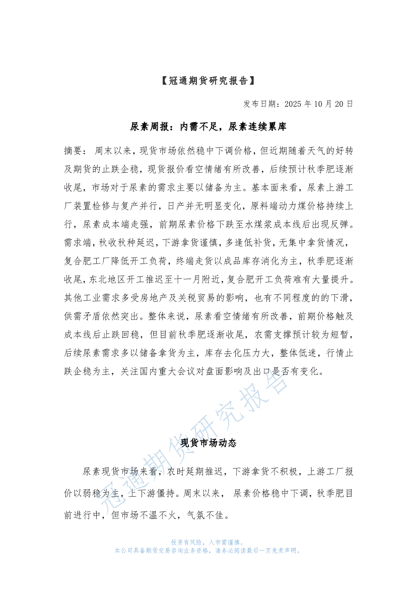冠通期货-尿素周报:内需不足,尿素连续累库-251020