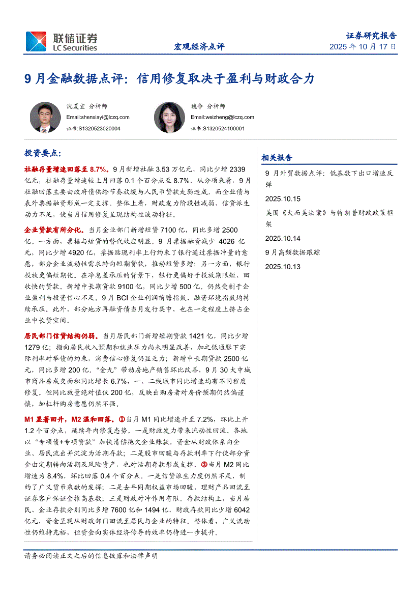 联储证券-9月金融数据点评:信用修复取决于盈利与财政合力-251017