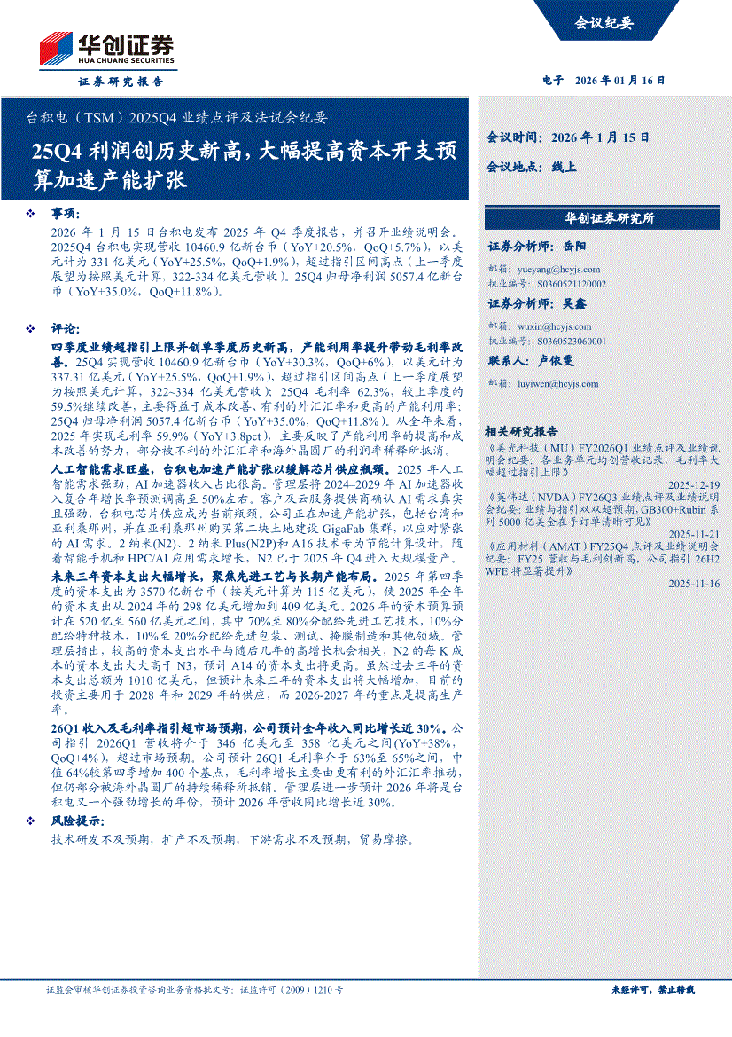 台积电:华创证券-台积电-TSM.US-2025Q4业绩点评及法说会纪要:25Q4利润创历史新高,大幅提高资本开支预算加速产能扩张-260116