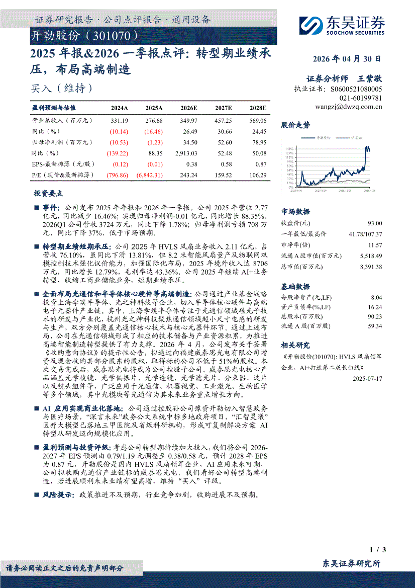 开勒股份:东吴证券-开勒股份-301070-2025年报&2026一季报点评:转型期业绩承压,布局高端制造-260430