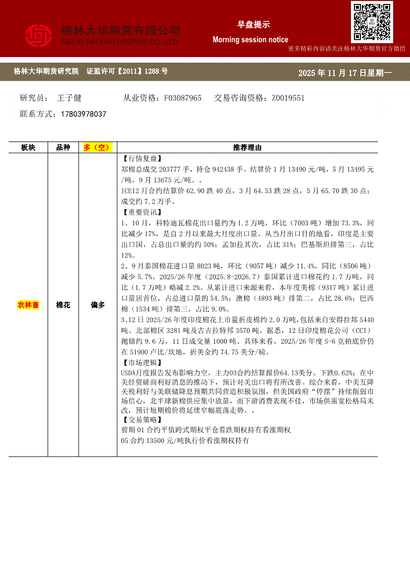 格林大华期货-早盘提示:棉花-251117