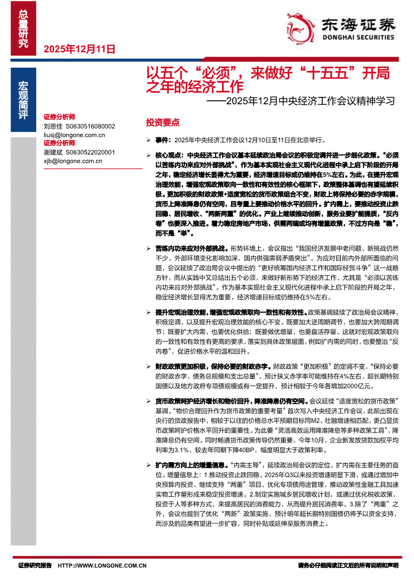 东海证券-2025年12月中央经济工作会议精神学习:以五个“必须”,来做好“十五五”开局之年的经济工作-251211