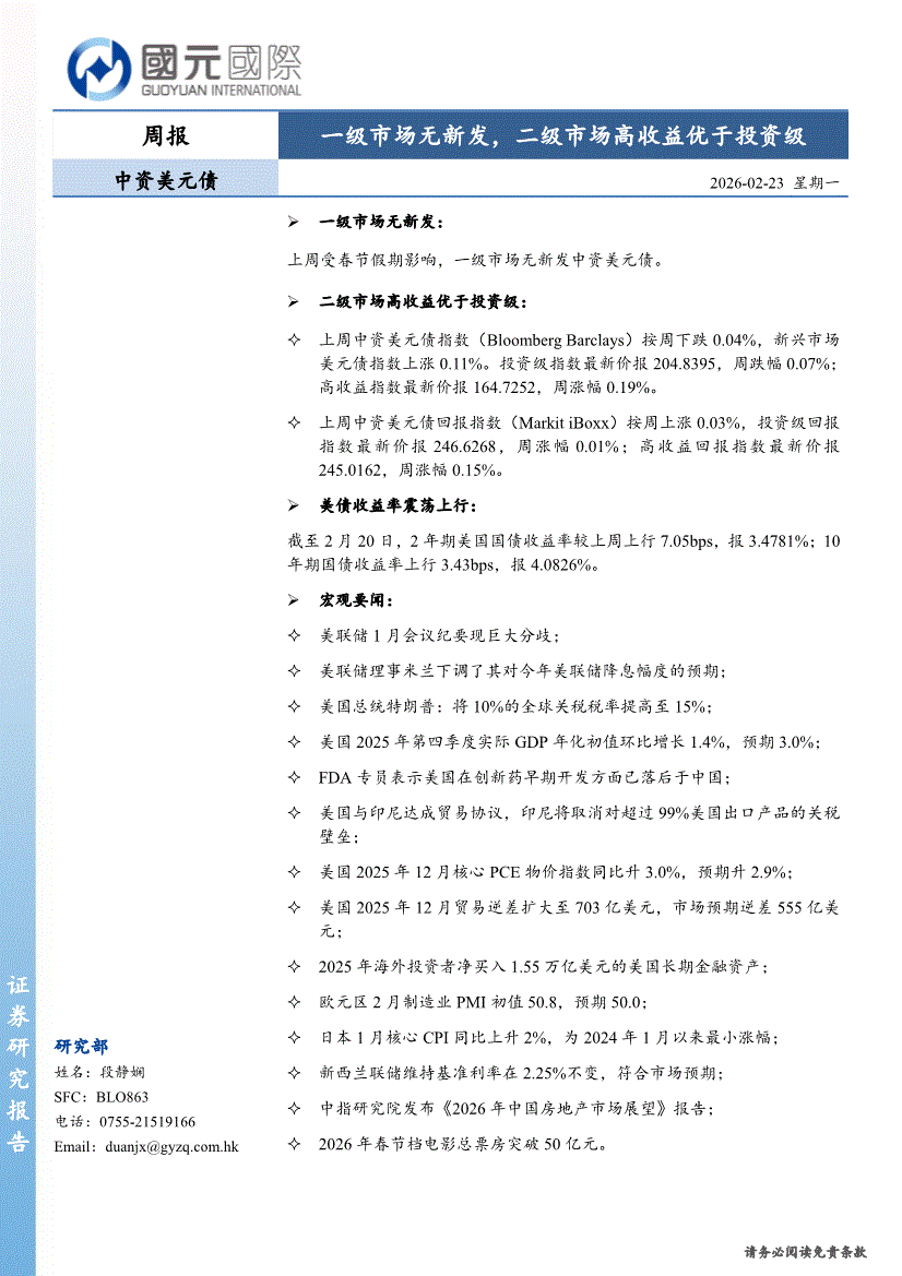 国元国际-中资美元债周报:一级市场无新发,二级市场高收益优于投资级-260223