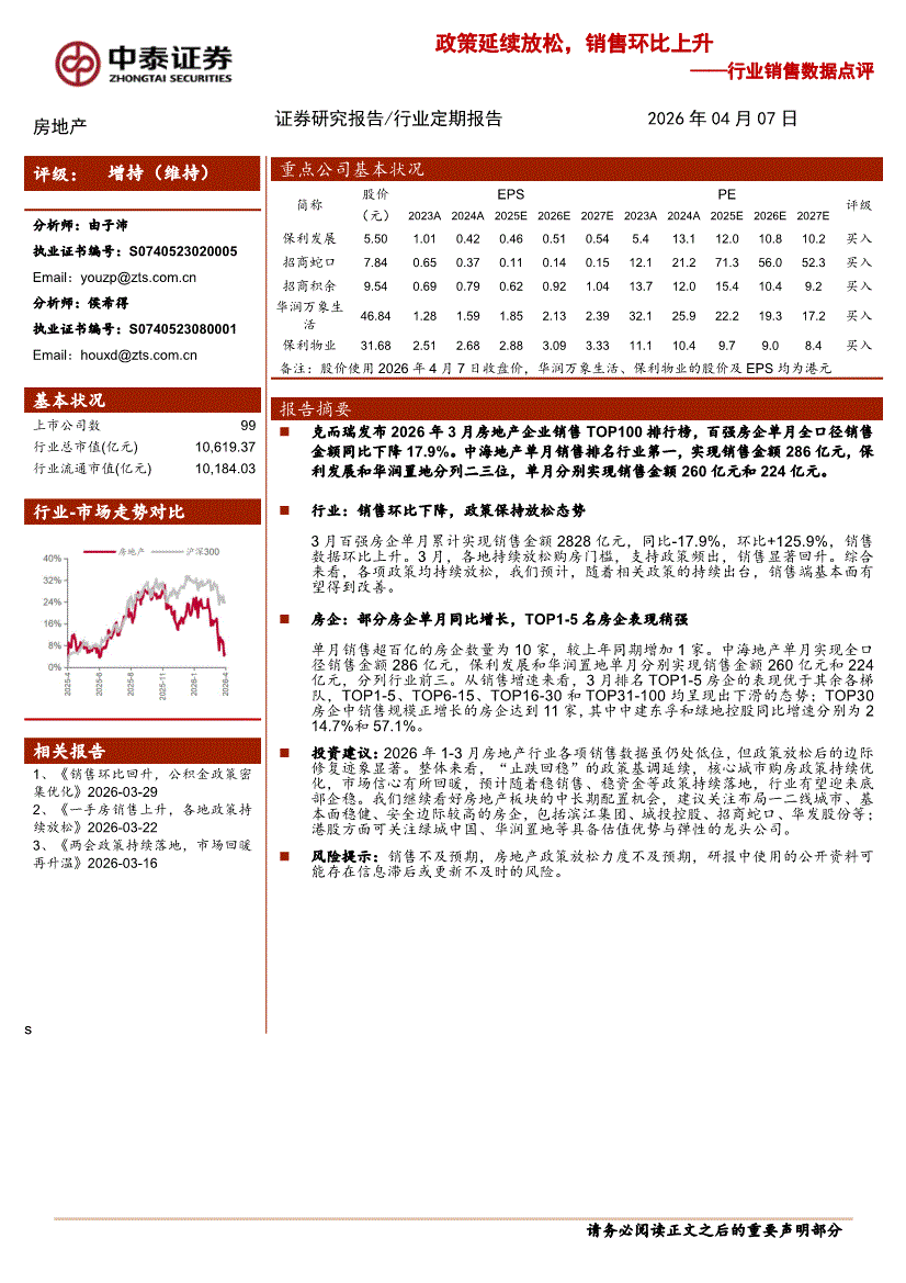 房地产行业:中泰证券-房地产行业销售数据点评:政策延续放松,销售环比上升-260407