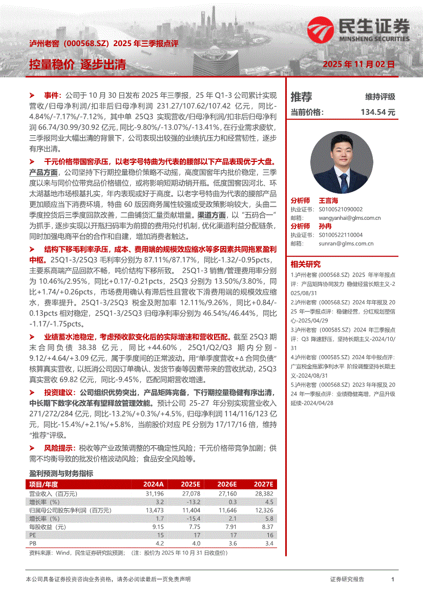 泸州老窖:民生证券-泸州老窖-000568-2025年三季报点评:控量稳价,逐步出清-251102