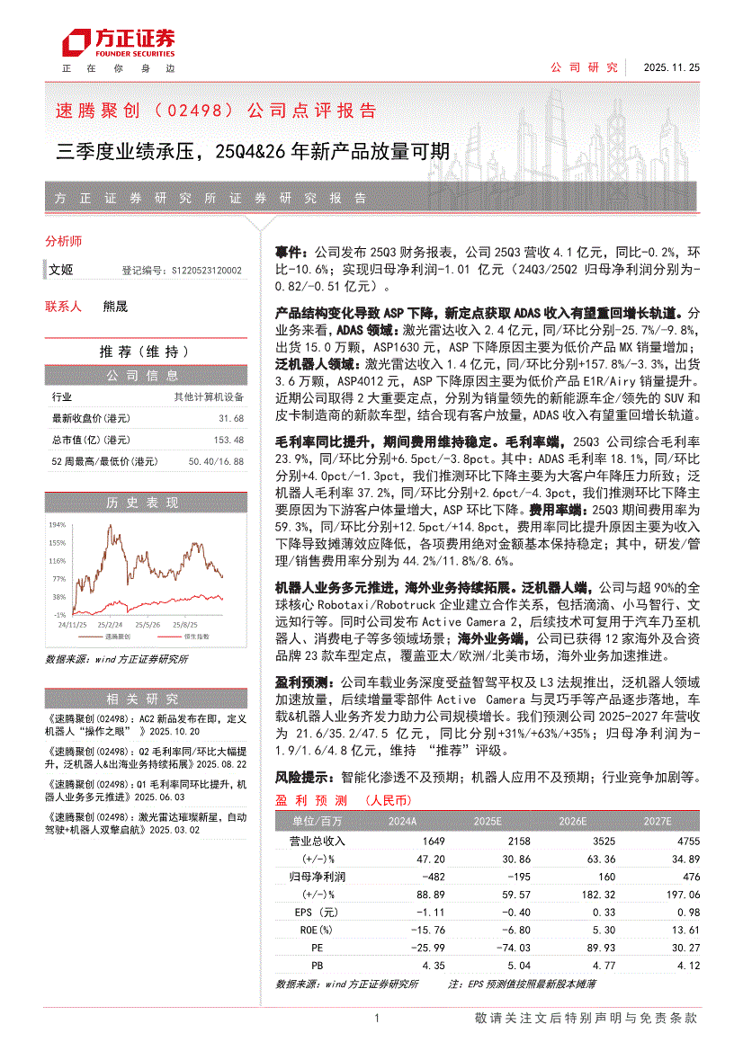 速腾聚创:方正证券-速腾聚创-2498.HK-公司点评报告:三季度业绩承压,25Q4&26年新产品放量可期-251125