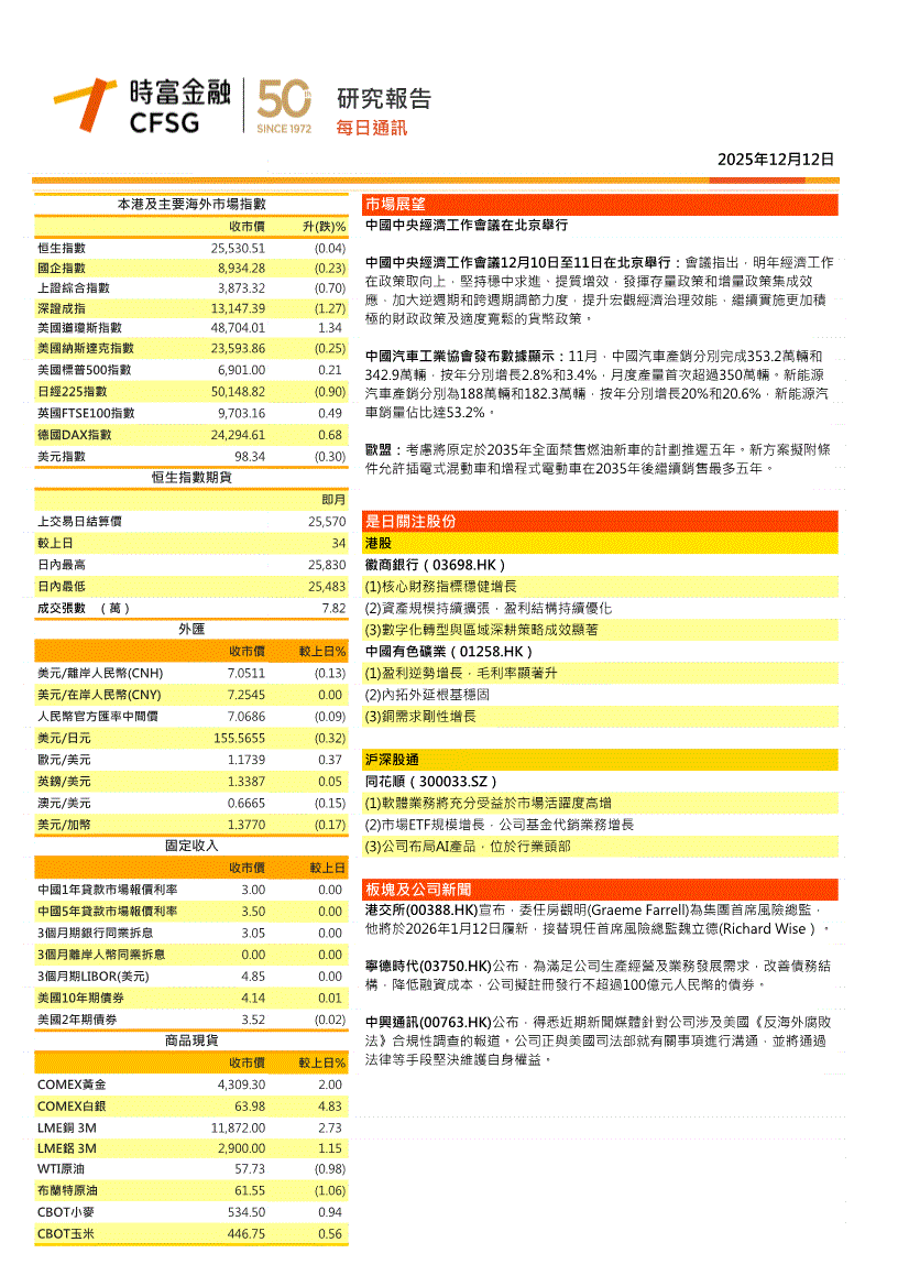 新华汇富-滙富快訊:香港及中国市场日报-251212