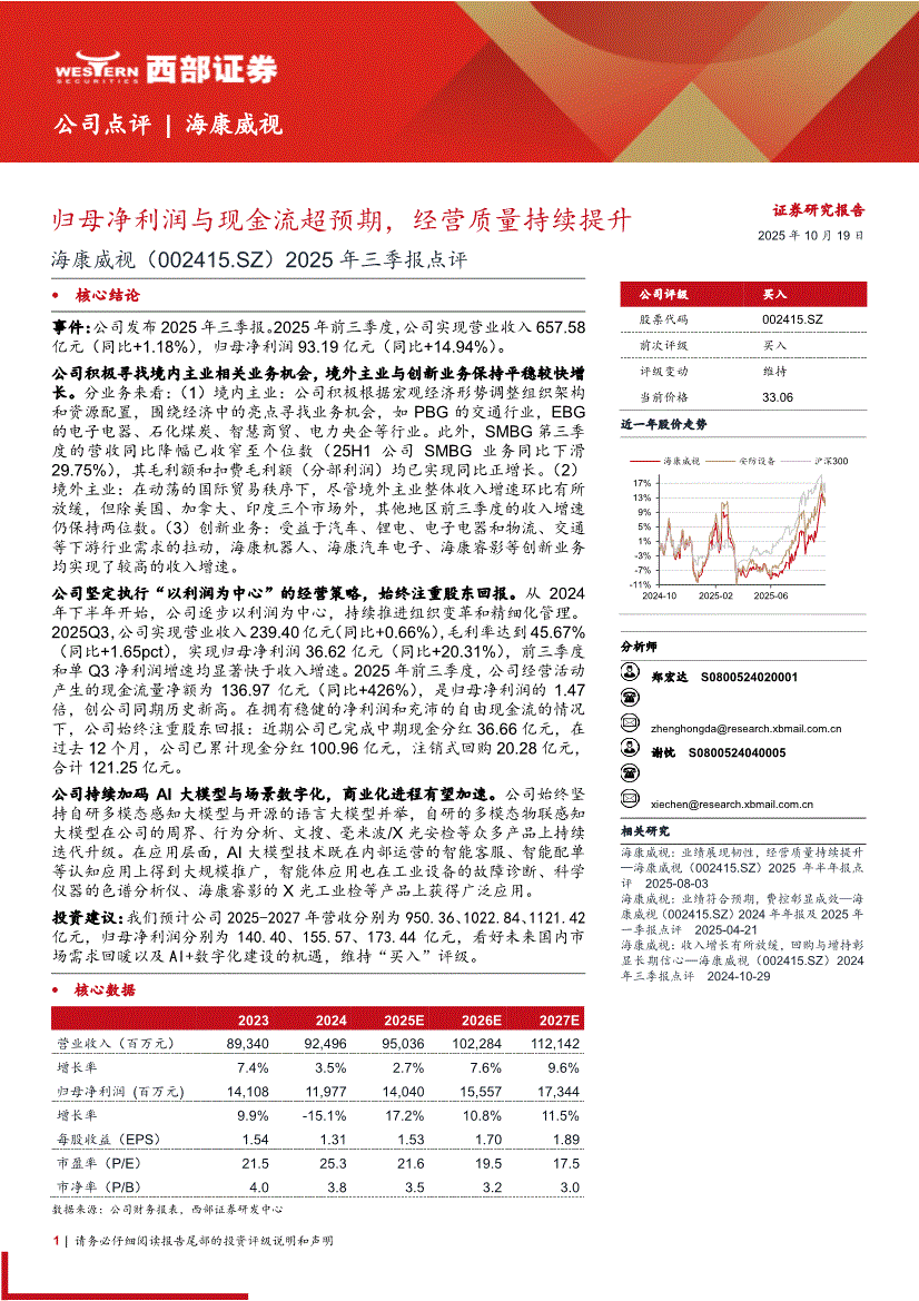 海康威视:西部证券-海康威视-002415-2025年三季报点评:归母净利润与现金流超预期,经营质量持续提升-251019