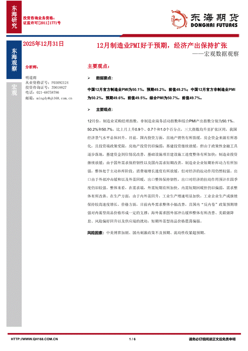 东海期货-宏观数据观察:12月制造业PMI好于预期,经济产出保持扩张-251231