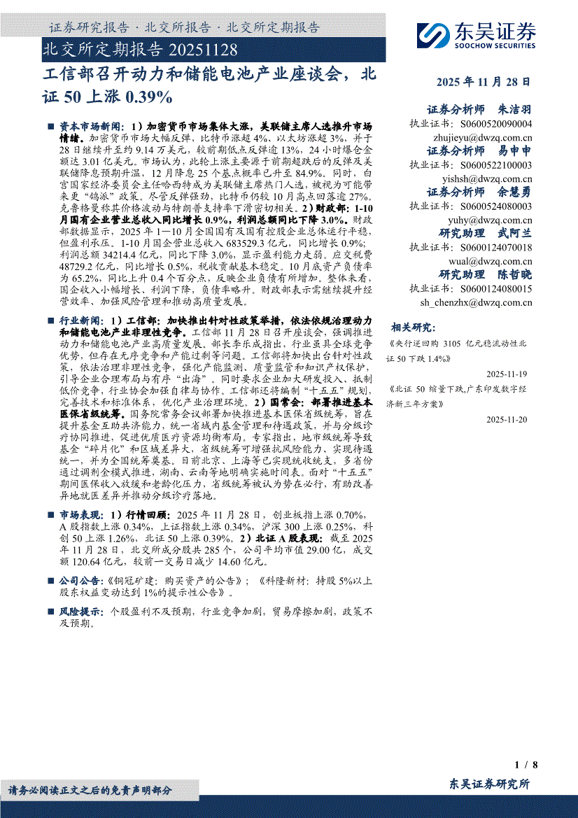 东吴证券-北交所定期报告:工信部召开动力和储能电池产业座谈会,北证50上涨0.39%-251128