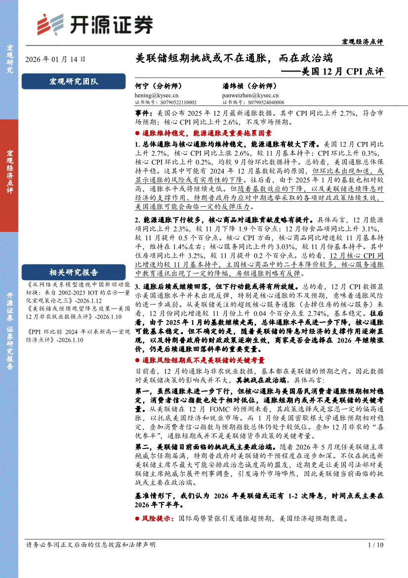 开源证券-美国12月CPI点评:美联储短期挑战或不在通胀,而在政治端-260114