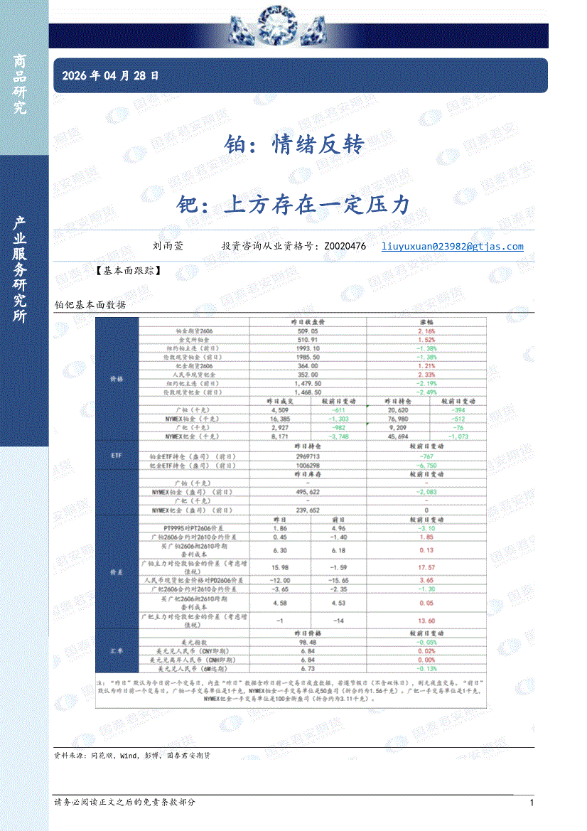 国泰君安期货-铂:情绪反转,钯,上方存在一定压力-260428