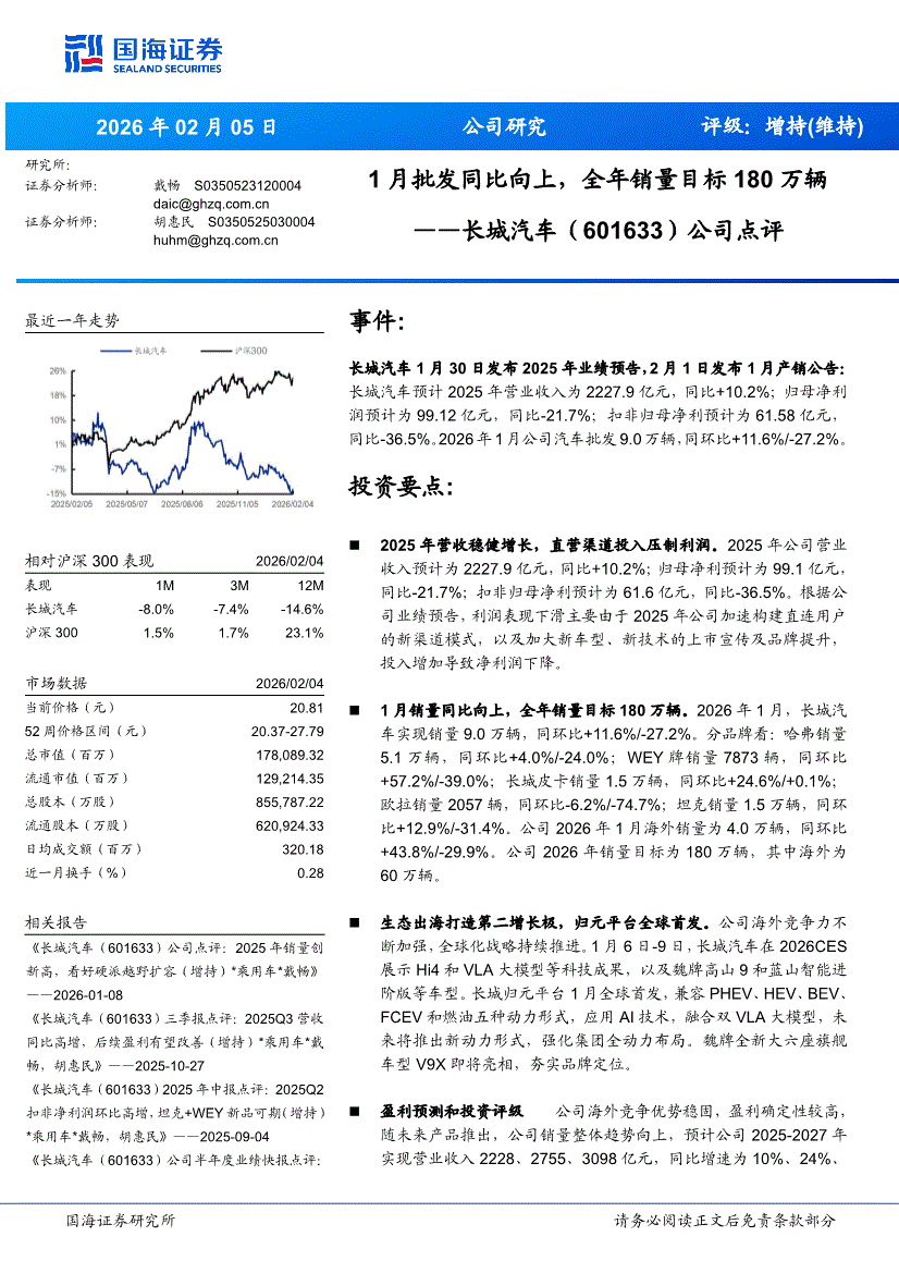 长城汽车:国海证券-长城汽车-601633-公司点评:1月批发同比向上,全年销量目标180万辆-260205