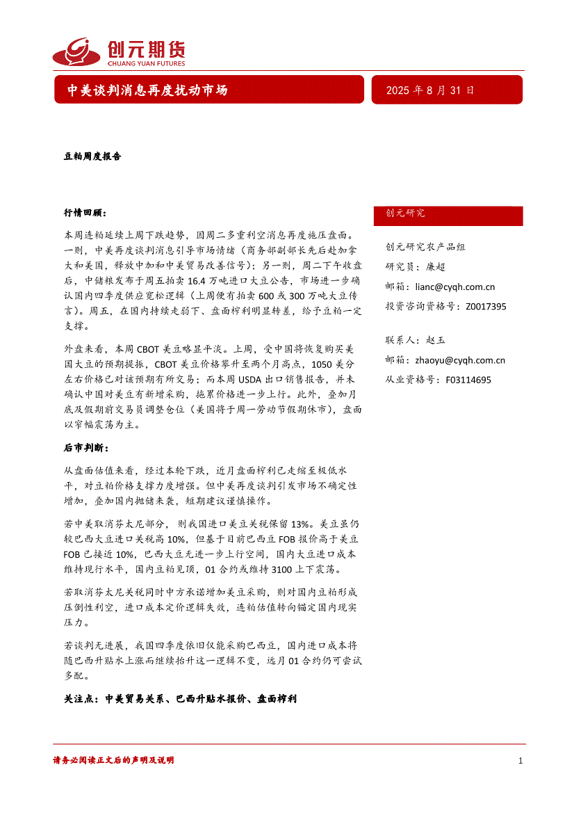 创元期货-豆粕周度报告:中美谈判消息再度扰动市场-250831