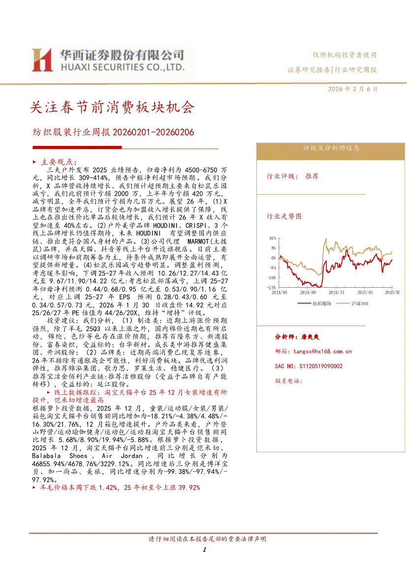 纺织服装行业:华西证券-纺织服装行业周报:关注春节前消费板块机会-260206