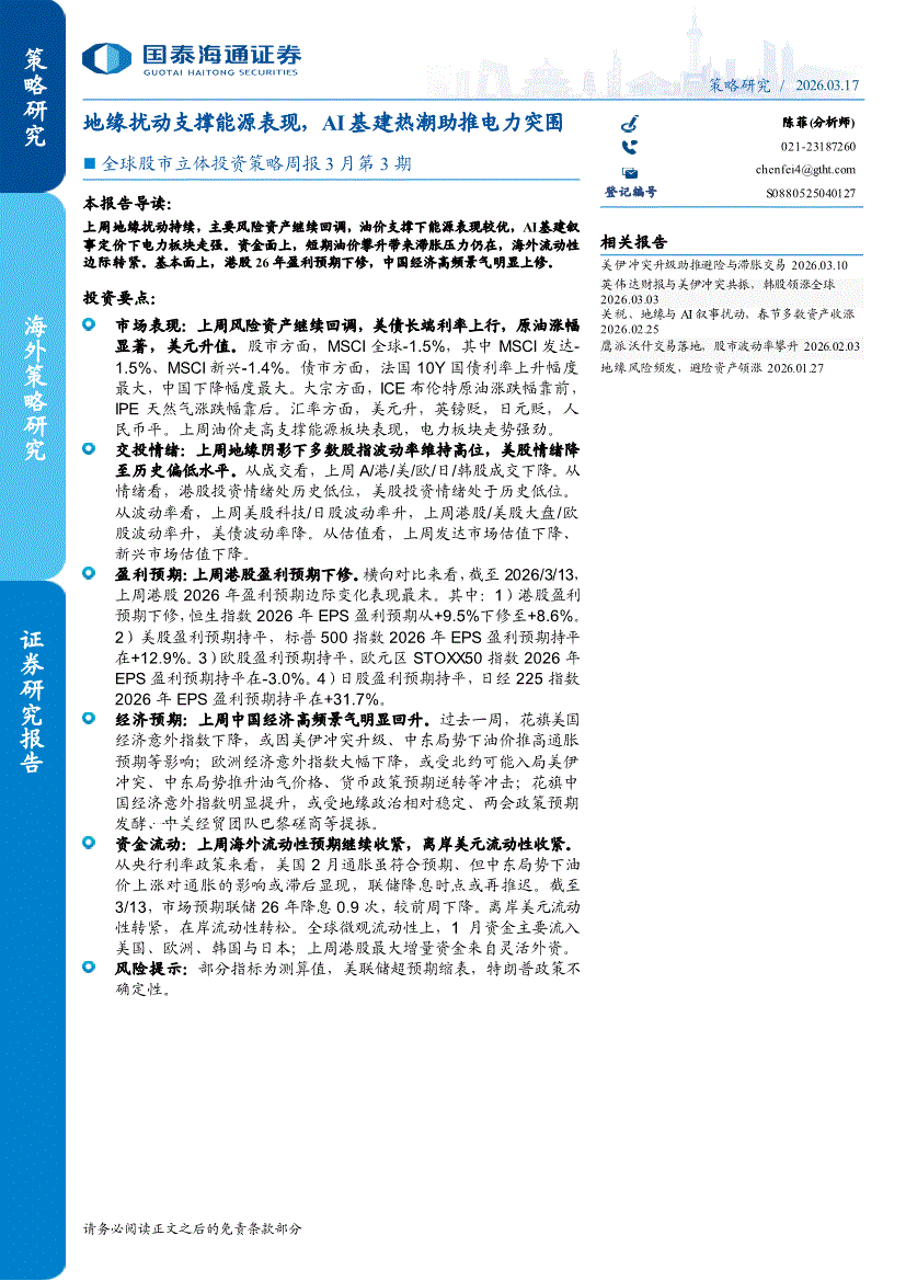 国泰海通证券-全球股市立体投资策略周报3月第3期:地缘扰动支撑能源表现,AI基建热潮助推电力突围-260317
