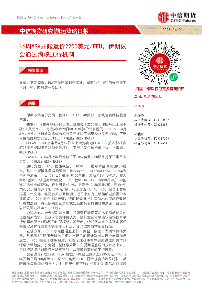 中信期货-航运策略日报:16周MSK开舱运价2200美元/FEU,伊朗议会通过海峡通行机制-260401