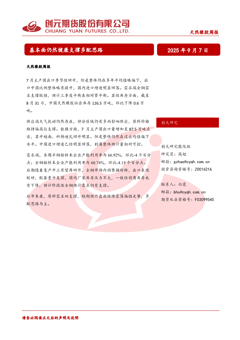 创元期货-天然橡胶周报:基本面仍然健康支撑多配思路-250907