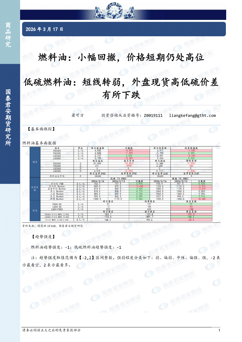 国泰君安期货-燃料油:小幅回撤,价格短期仍处高位,低硫燃料油,短线转弱,外盘现货高低硫价差有所下跌-260317
