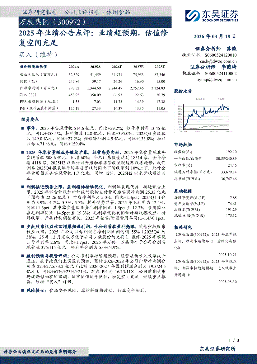 万辰集团:东吴证券-万辰集团-300972-2025年业绩公告点评:业绩超预期,估值修复空间充足-260318
