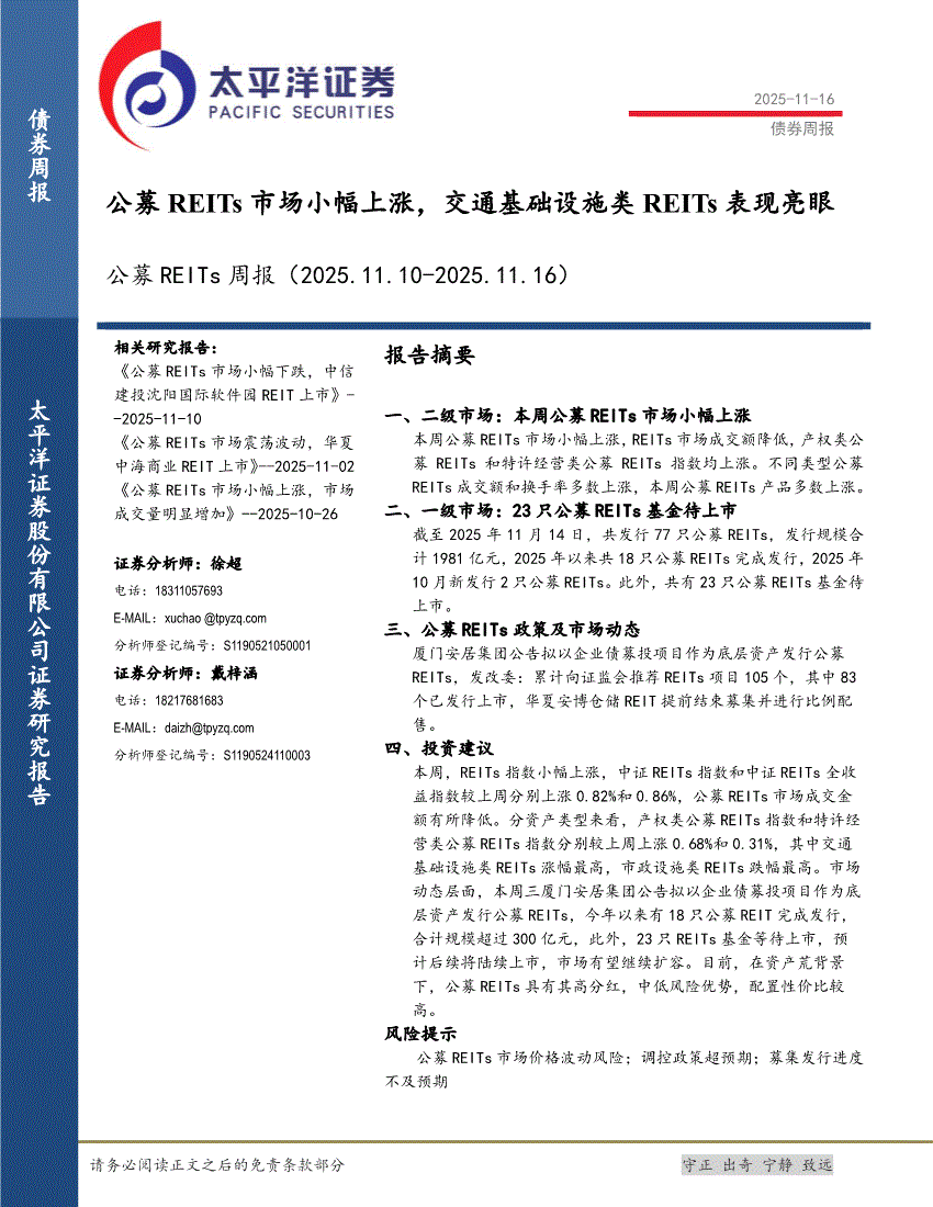 太平洋证券-公募REITs周报:公募REITs市场小幅上涨,交通基础设施类REITs表现亮眼-251116
