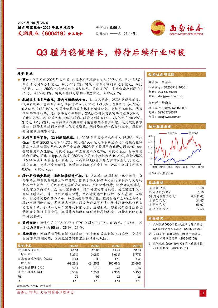 天润乳业:西南证券-天润乳业-600419-Q3疆内稳健增长,静待后续行业回暖-251026