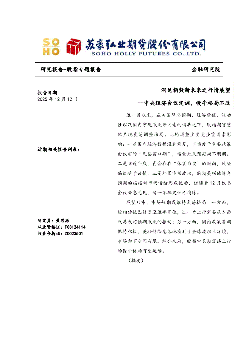 弘业期货-洞见指数新未来之行情展望:中央经济会议定调,慢牛格局不改-251212