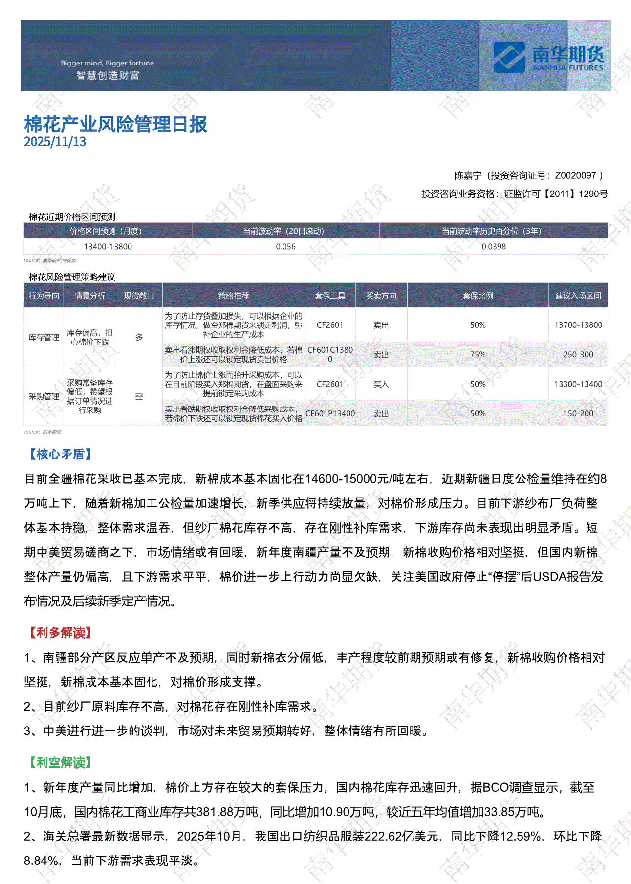 南华期货-棉花棉纱周报:新棉加工速度加快,短期供给压力加大-251114