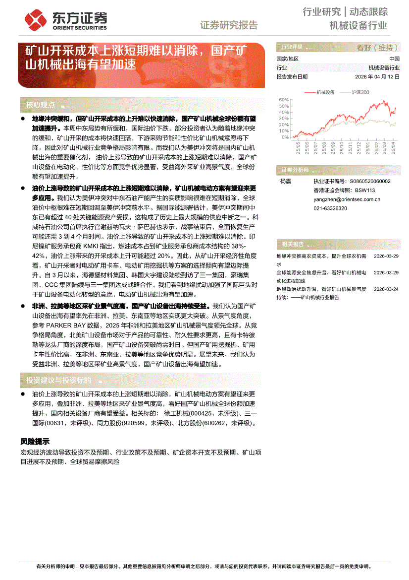 机械设备行业:东方证券-机械设备行业动态跟踪:矿山开采成本上涨短期难以消除,国产矿山机械出海有望加速-260412