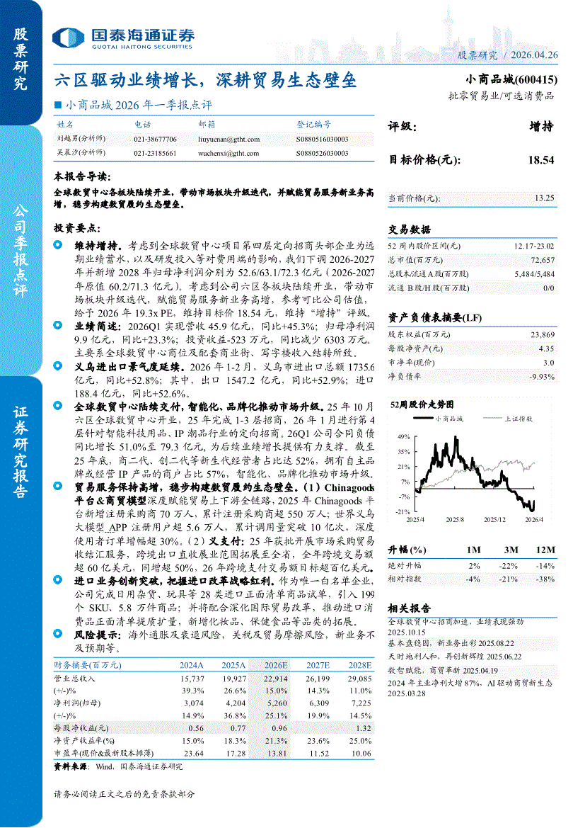 小商品城:国泰海通证券-小商品城-600415-2026年一季报点评:六区驱动业绩增长,深耕贸易生态壁垒-260426
