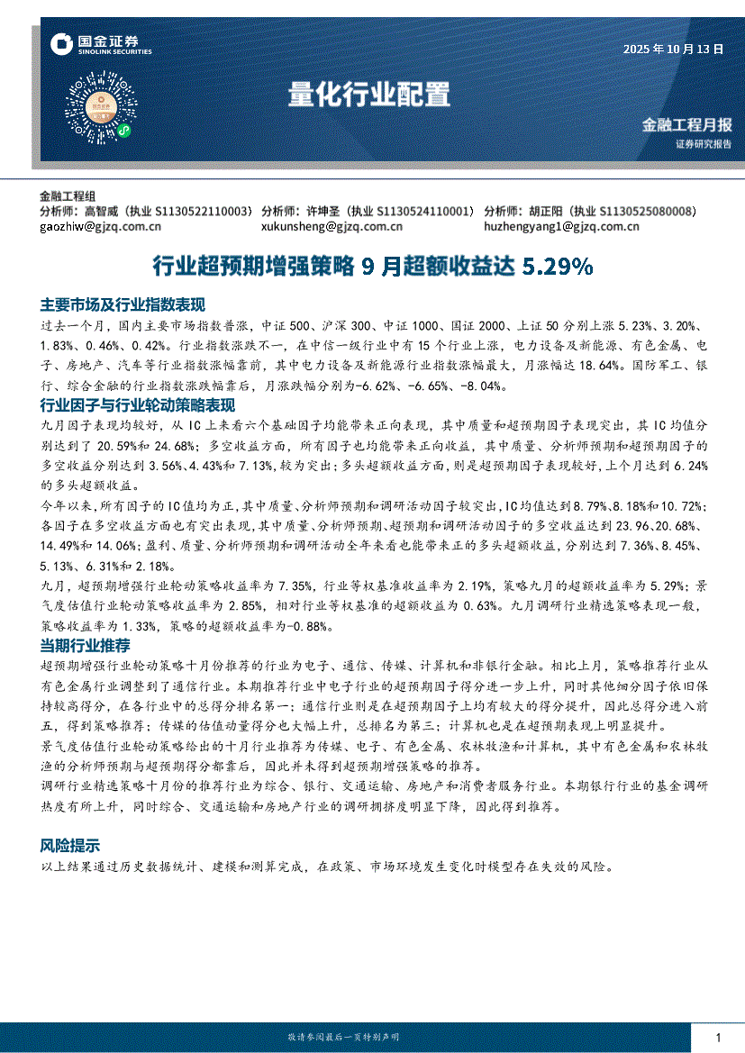 国金证券-量化行业配置:行业超预期增强策略9月超额收益达5.29%-251013