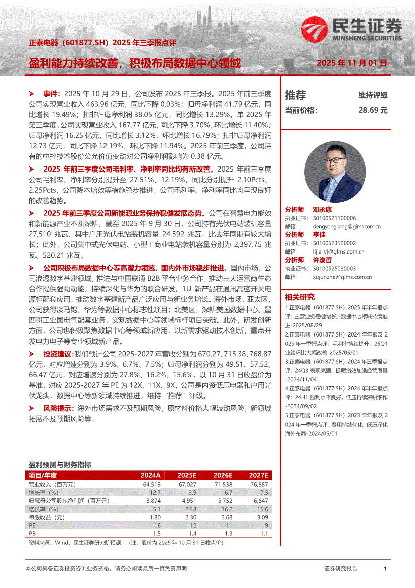 正泰电器:民生证券-正泰电器-601877-2025年三季报点评:盈利能力持续改善,积极布局数据中心领域-251101